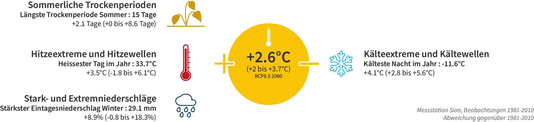 In der Schweiz verläuft die Klimaerwärmung doppelt so schnell als auf globaler Ebene. Aufgrund ihrer geographischen Lage hat sich die durchschnittliche Temperatur seit 1864 um 2.6°C im Vergleich zu den globalen 1.3°C erhöht. Dabei trifft die Klimaerwärmung das Wallis besonders stark.
