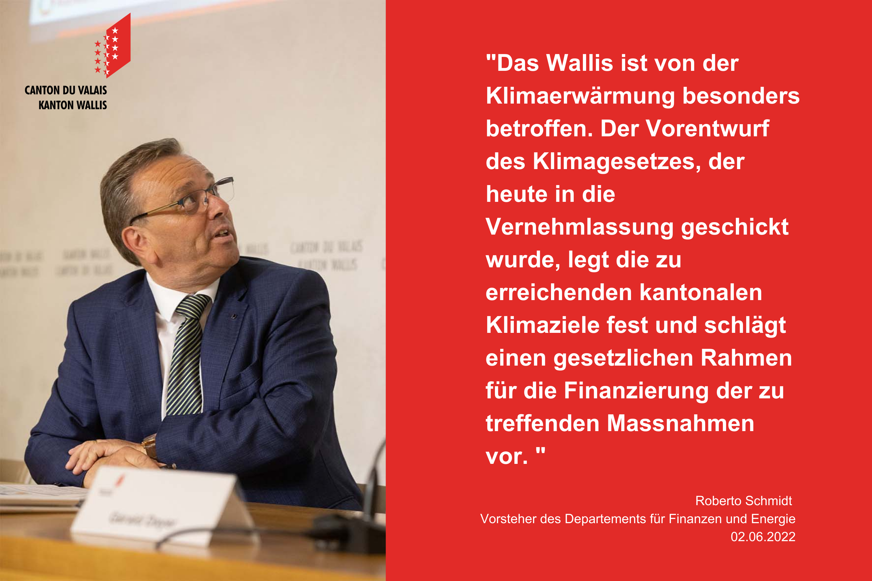 Das Wallis ist als Bergkanton besonders stark von der Klimaerwärmung betroffen. Um die negativen Auswirkungen des Klimawandels auf dem Kantonsgebiet möglichst zu verhindern und abzufedern und um die Menschen, die biologische Vielfalt und die materiellen Güter zu schützen, schickt der Staatsrat einen Vorentwurf eines Klimagesetzes in die Vernehmlassung. Darin werden Klimaziele festgelegt und eine Rechtsgrundlage für die erforderlichen Massnahmen geschaffen. Die Ziele sind mit denjenigen des Bundes abgestimmt, das heisst, bis 2050 soll ein CO2-Netto-Null-Emissionswert erreicht werden. Die direkten Emissionen der kantonalen Verwaltung sollen bereits 2040 netto null erreichen. Der Gesetzesvorentwurf sieht die Erstellung eines kantonalen Klimaplans vor, in dem die Massnahmen zur Reduktion der Treibhausgasemissionen und zur Anpassung an den Klimawandel festgelegt werden. Zur Finanzierung von Grossprojekten schlägt der Staatsrat die Bildung einer Klimareserve mit einer Anfangsdotierung von 150 Millionen Franken aus dem Staatsvermögen vor.