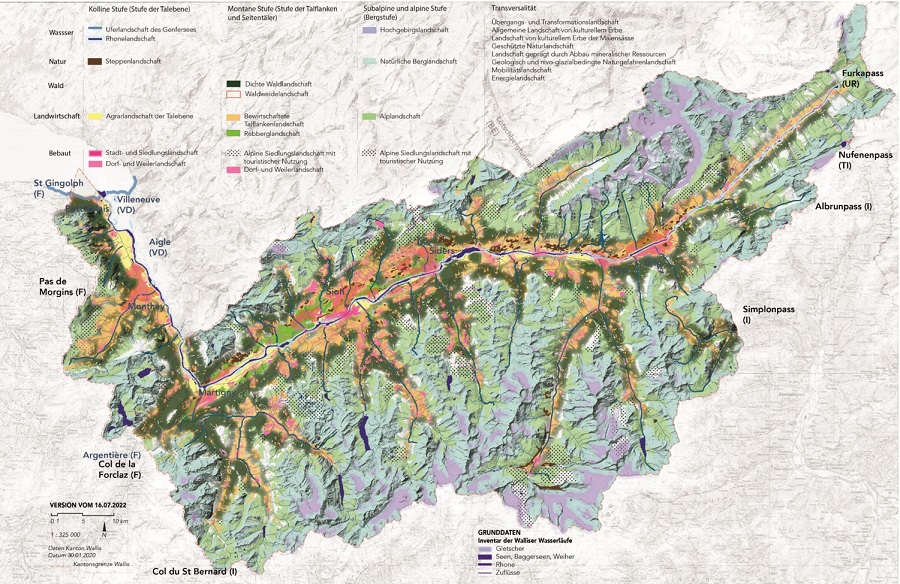 Bei diesem Vorgehen soll die kantonale Landschaft unter Wahrung der im Wallis vorhandenen landschaftlichen Qualitäten entwickelt werden. Zu diesem Zweck erstellt das kantonale Landschaftskonzept eine Typologie der Walliser Landschaften, die es ermöglicht, ihre Qualitäten zu definieren, aber auch die für sie spezifischen Schutz- und Aufwertungsziele festzulegen. Insgesamt wurden vierzehn dominante und acht transversale Landschaften erfasst. Diese Typologie wurde durch eine Datenanalyse sowie durch Begehungen vor Ort erstellt, die von Experten und den zuständigen kantonalen Dienststellen in Zusammenarbeit mit den Gemeinden durchgeführt wurden.