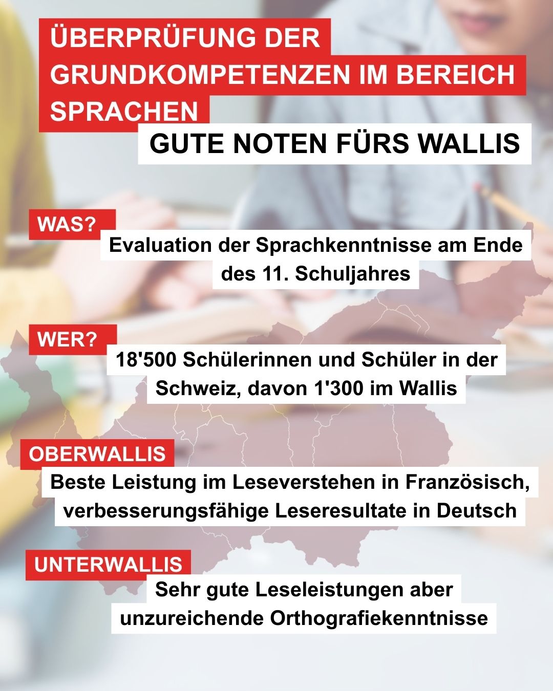 Im Jahr 2023 beurteilte die Konferenz der kantonalen Erziehungsdirektorinnen und -direktoren die Grundkompetenzen in Schulsprache sowie in der zweiten und dritten Sprache der Schülerinnen und Schüler im 11. Schuljahr. Diese Überprüfung wurde in der ganzen Schweiz durchgeführt. Sie zeigt auf, dass die Kantone auf gutem Wege sind, die überprüften Kompetenzen nach Sprachregionen zu harmonisieren. Das Wallis gehört erneut zu den Besten – sowohl im nationalen als auch im Westschweizer Vergleich. Im Oberwallis muss allerdings ein Schwerpunkt auf das Leseverstehen der Schulsprache gelegt werden. Die Ergebnisse der Schülerinnen und Schüler im Unterwallis sind in der französischen Orthografie unzureichend.