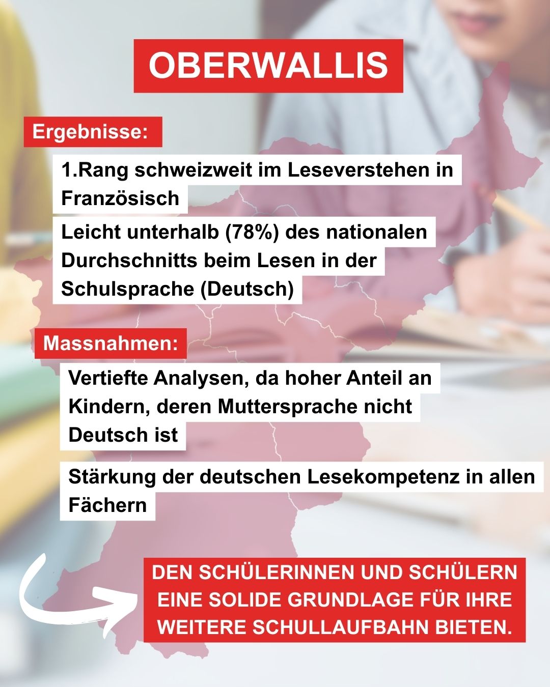 Die Schülerinnen und Schüler aus dem Oberwallis führen die nationale Rangliste im Leseverstehen in Französisch (Zweitsprache) mit 66 Prozent an. Der Staat Wallis will diese Dynamik beibehalten und dafür sorgen, dass die Schülerinnen und Schüler ihre Sprachkenntnisse weiterhin nachhaltig entwickeln können. Durch gezielte Bestrebungen wird die Beherrschung von Französisch als Fremdsprache langfristig verbessert.