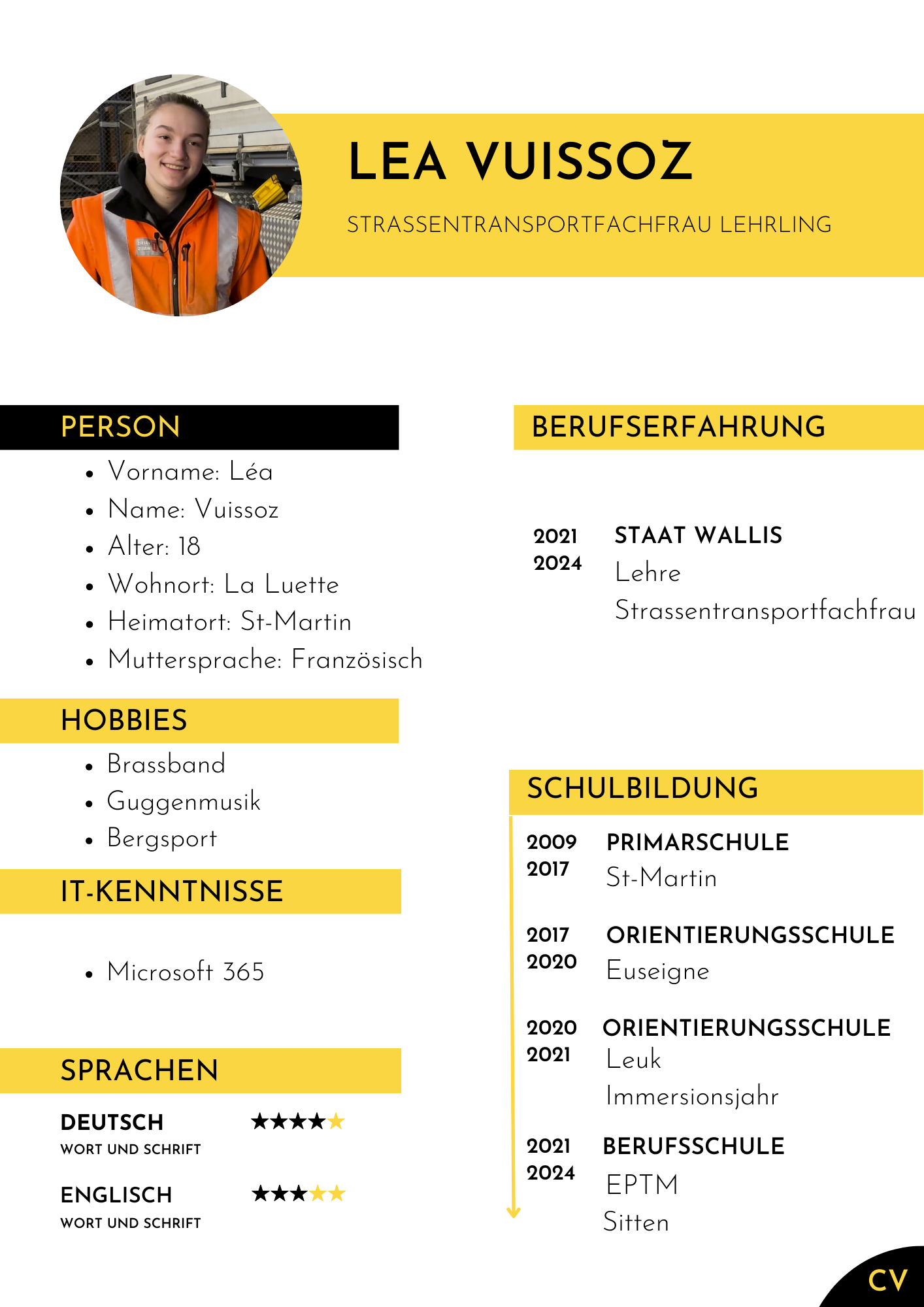 Lastwagen über alles. Léa Vuissoz hat ihre Leidenschaft zum Beruf gemacht und absolviert zurzeit eine Berufslehre als Strassentransportfachfrau EFZ. Seit 2021 gehört die junge Frau aus dem Val d’Hérens zum Team der Abteilung Transporte der Sektion Unterhaltslogistik der Kantonsstrassen und wird ihre Berufslehre im Juli 2024 abschliessen.