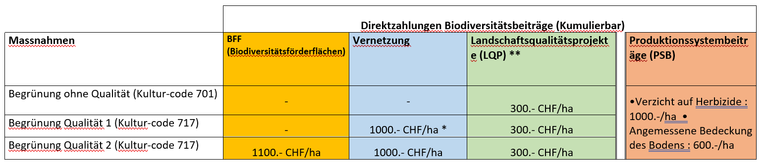 - Eine begrünte Parzelle kann von einem Beitrag von 300 CHF / ha mit LQP profitieren (dies hängt von den Projekten der Region ab)