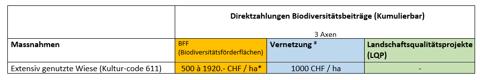 - Eine extensiv genutzte Wiesenfläche kann je nach Gebiet mit BFF einen Beitrag von 300.- bis 1920 CHF / ha erhalten.