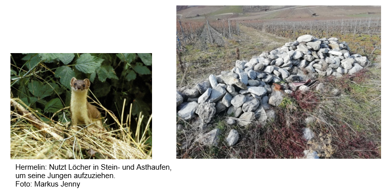 Verschiedene Arten von kleinen Strukturen, die in den Rebparzellen angebracht werden, tragen dazu bei, Insekten, Vögel und Kleintiere zu beherbergen.