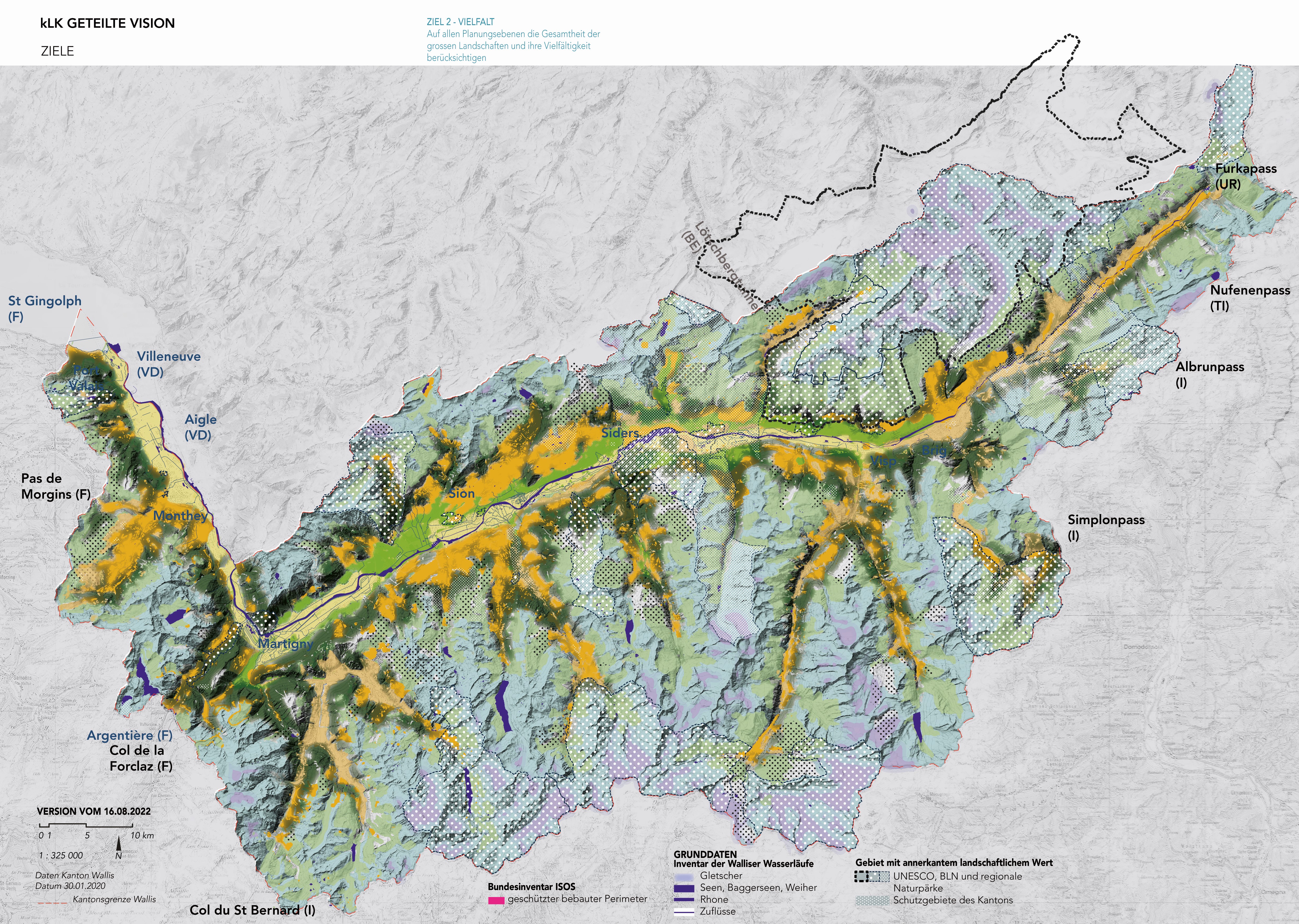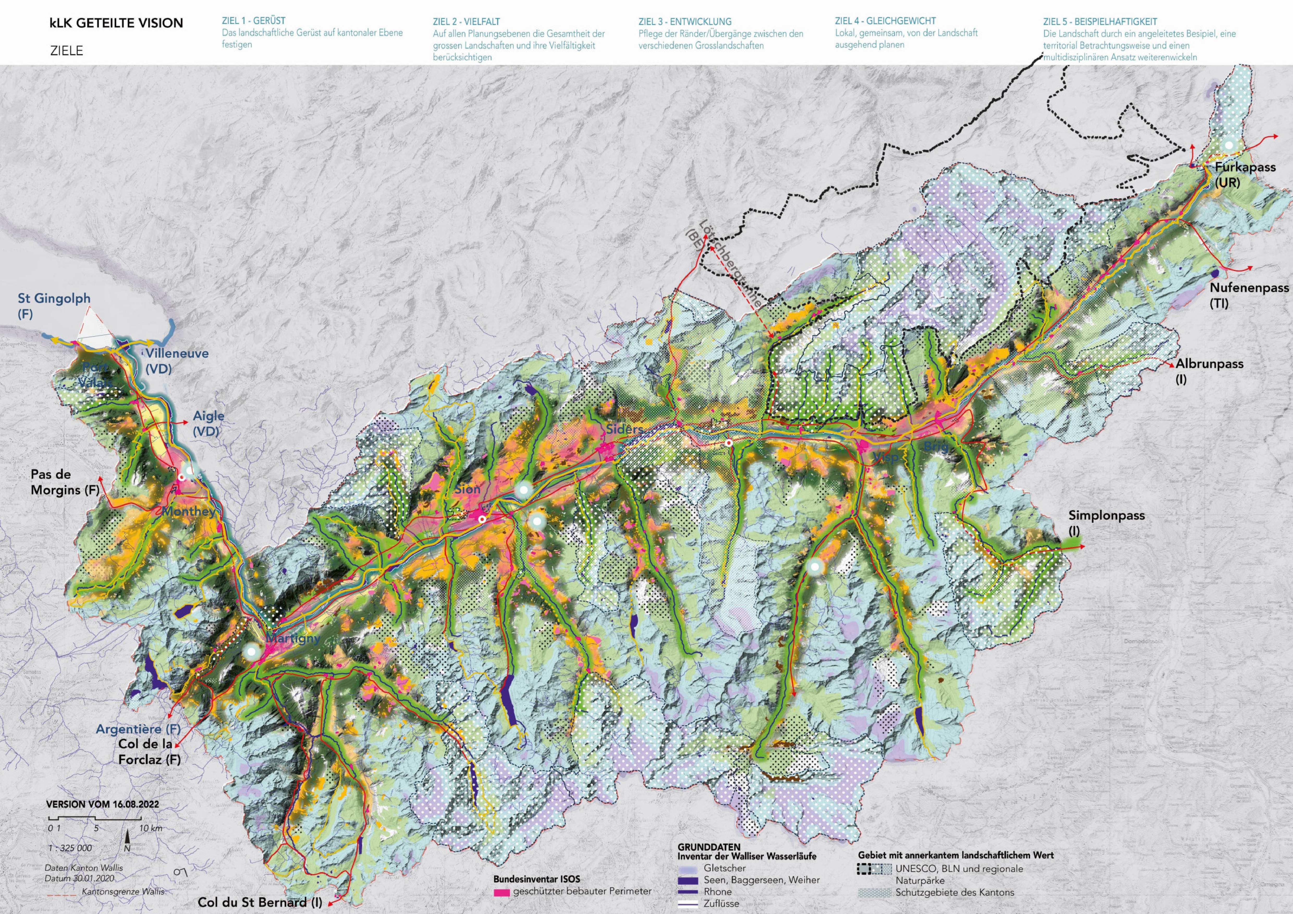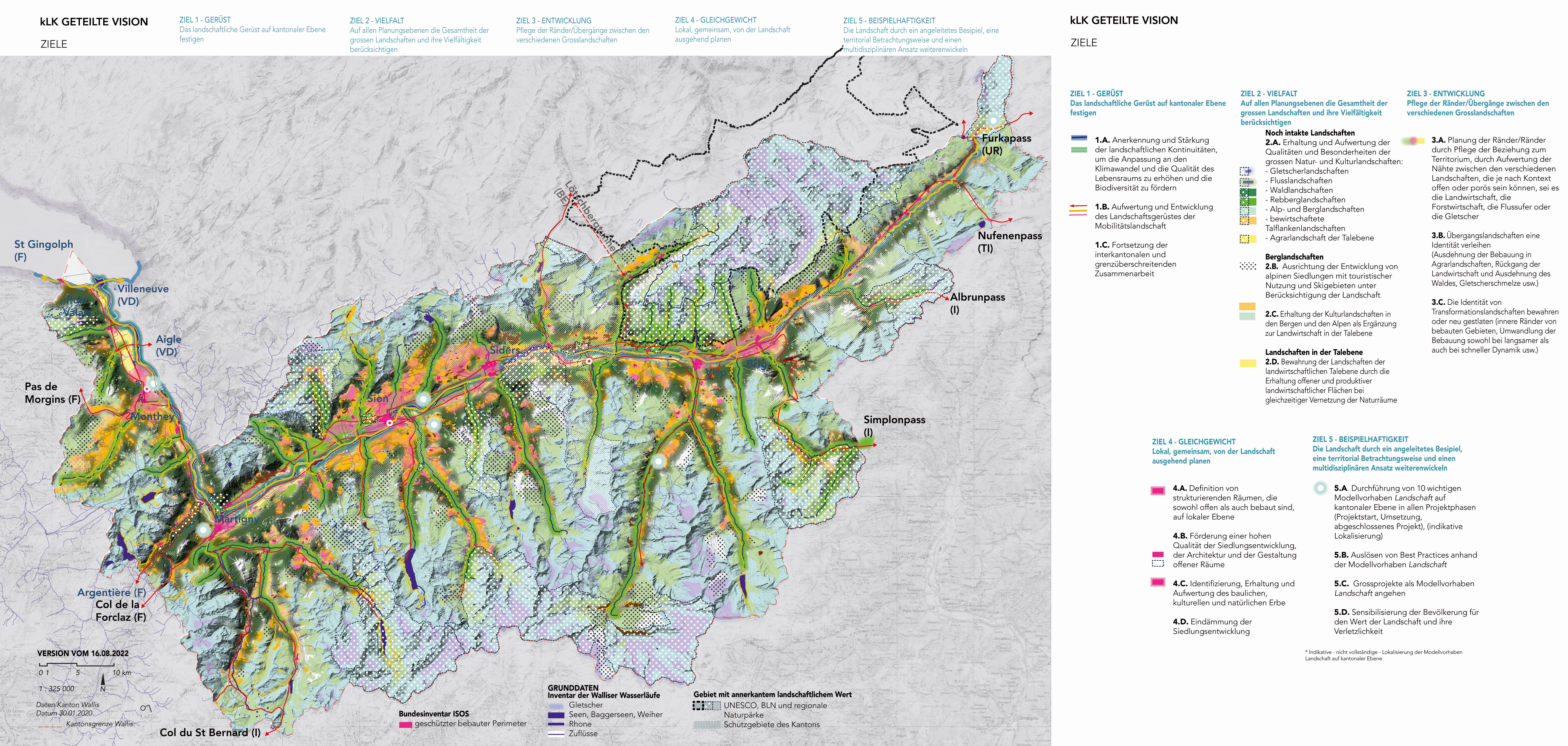 Die Karte der Walliser Landschaftstypologie stellt die 14 dominierenden thematischen Landschaften und die 8 nicht dargestellten Querschnittslandschaften dar. Die Karte der geteilten Vision stellt die 5 Hauptziele dar.