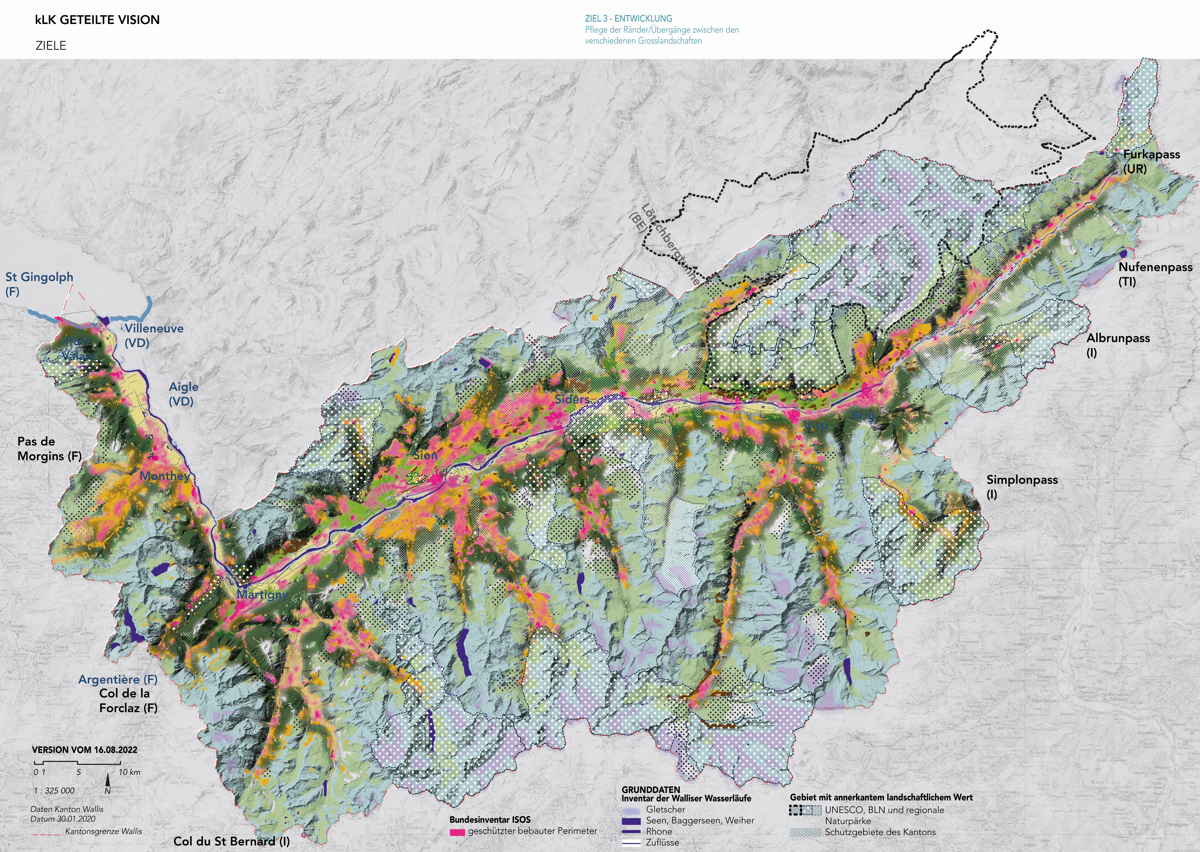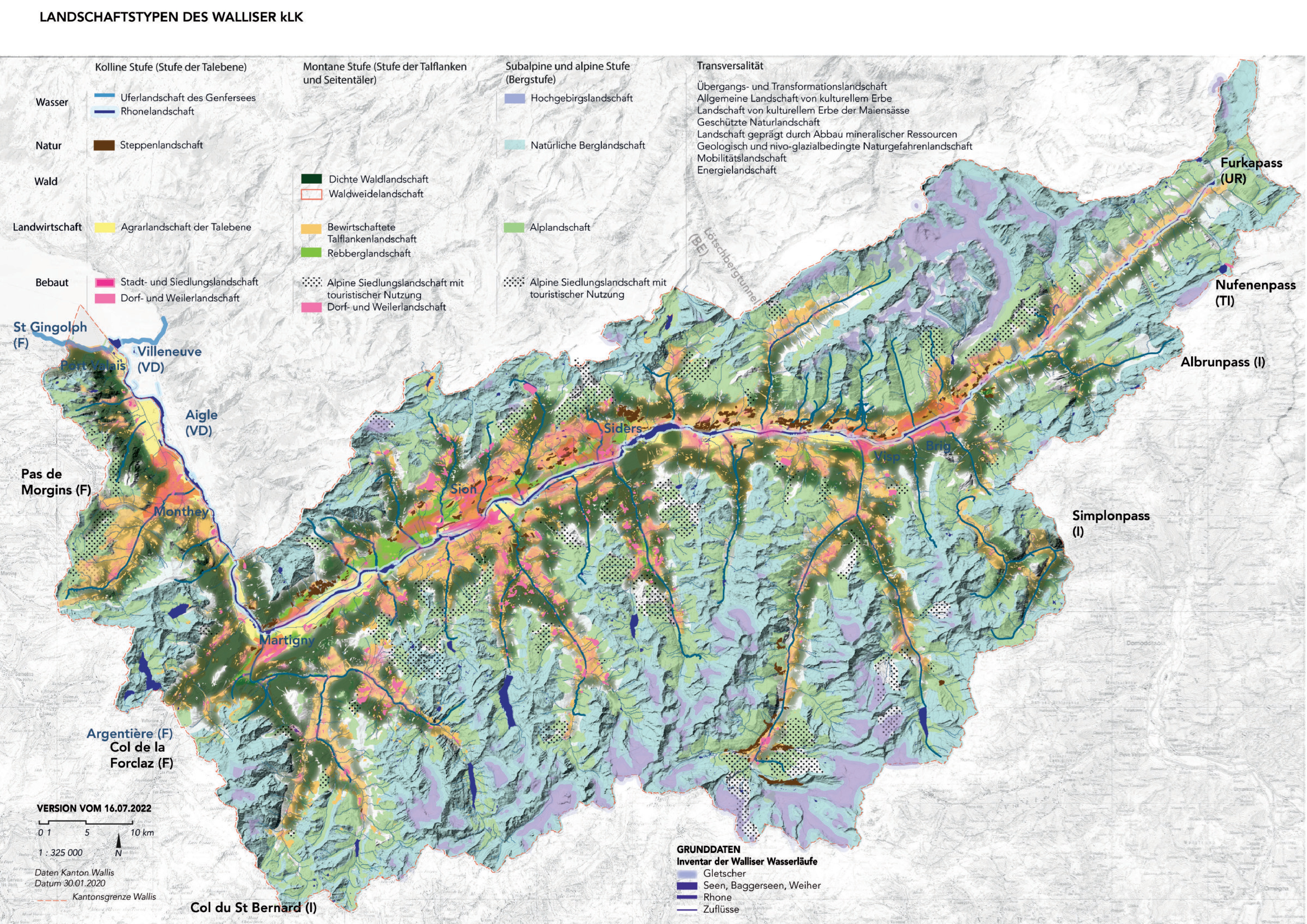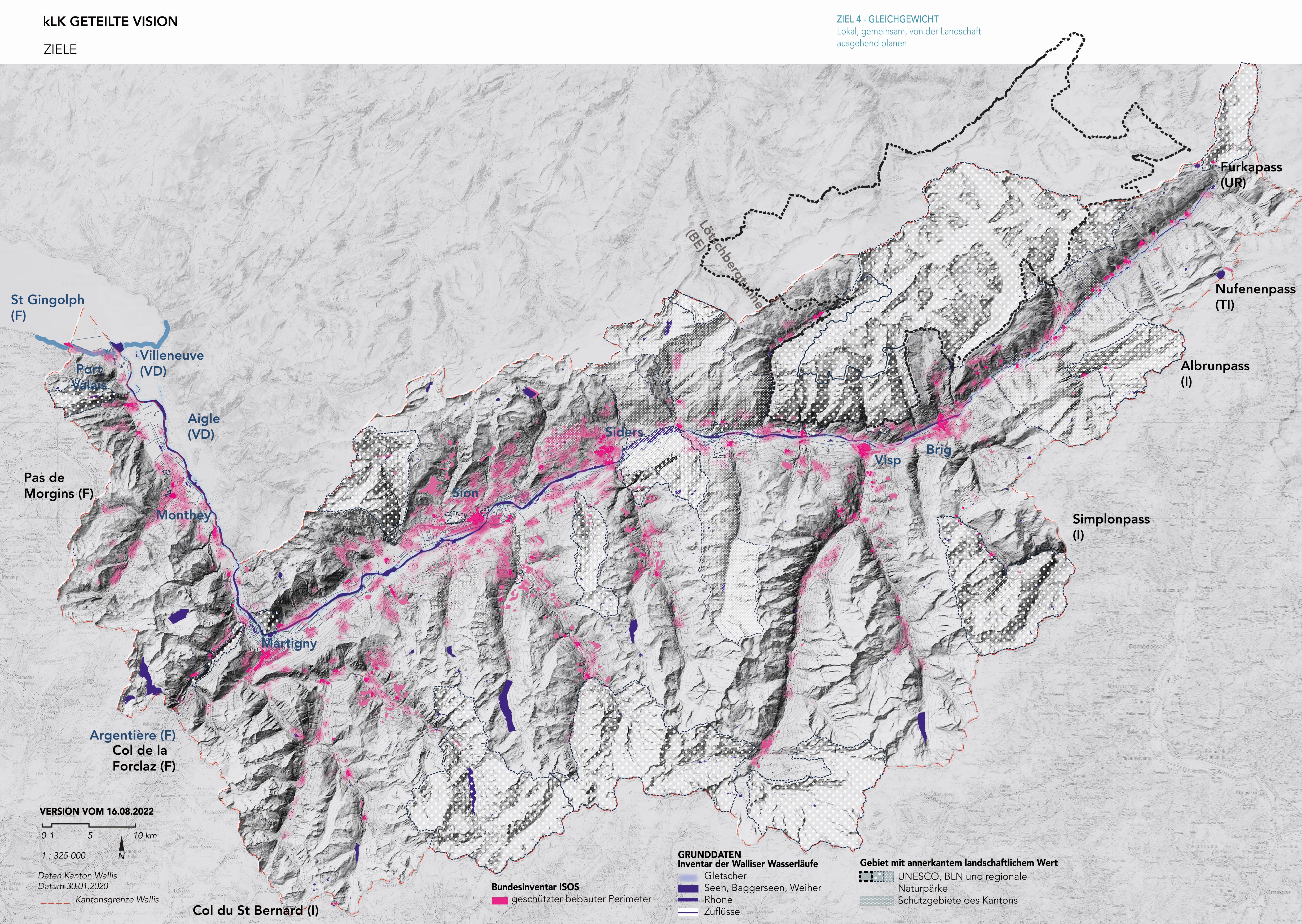 Die Karte der Walliser Landschaftstypologie stellt die 14 dominierenden thematischen Landschaften und die 8 nicht dargestellten Querschnittslandschaften dar. Die Karte der geteilten Vision stellt die 5 Hauptziele dar.