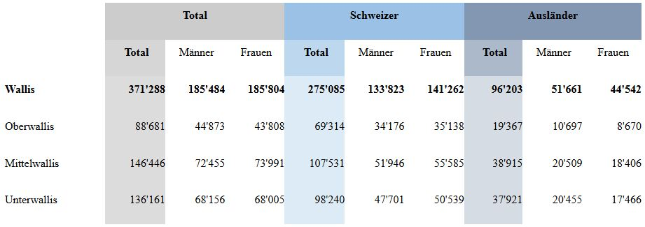 Im Jahr 2024 beträgt die ständige Wohnbevölkerung des Wallis 371’288 Einwohner (+5444), was einer Bevölkerungswachstumrate von +1.5% entspricht. Das Bevölkerungswachstum ist das dritthöchste des Landes. Der Schweizer Durchschnitt liegt bei +1.0%.