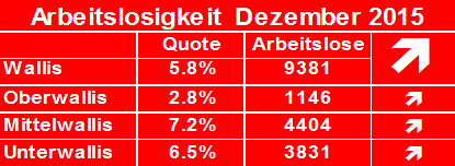 Ende Dezember 2015 waren in den Regionalen Arbeitsvermittlungszentren (RAV) des Wallis 9381 Arbeitslose gemeldet. Im Vergleich zu Ende November 2015 sind dies 2230 mehr. Der Anstieg der Arbeitslosigkeit im Wallis im Dezember (+1,4 Pkt. auf 5,8 %) basiert im Wesentlichen auf saisonalen Faktoren.