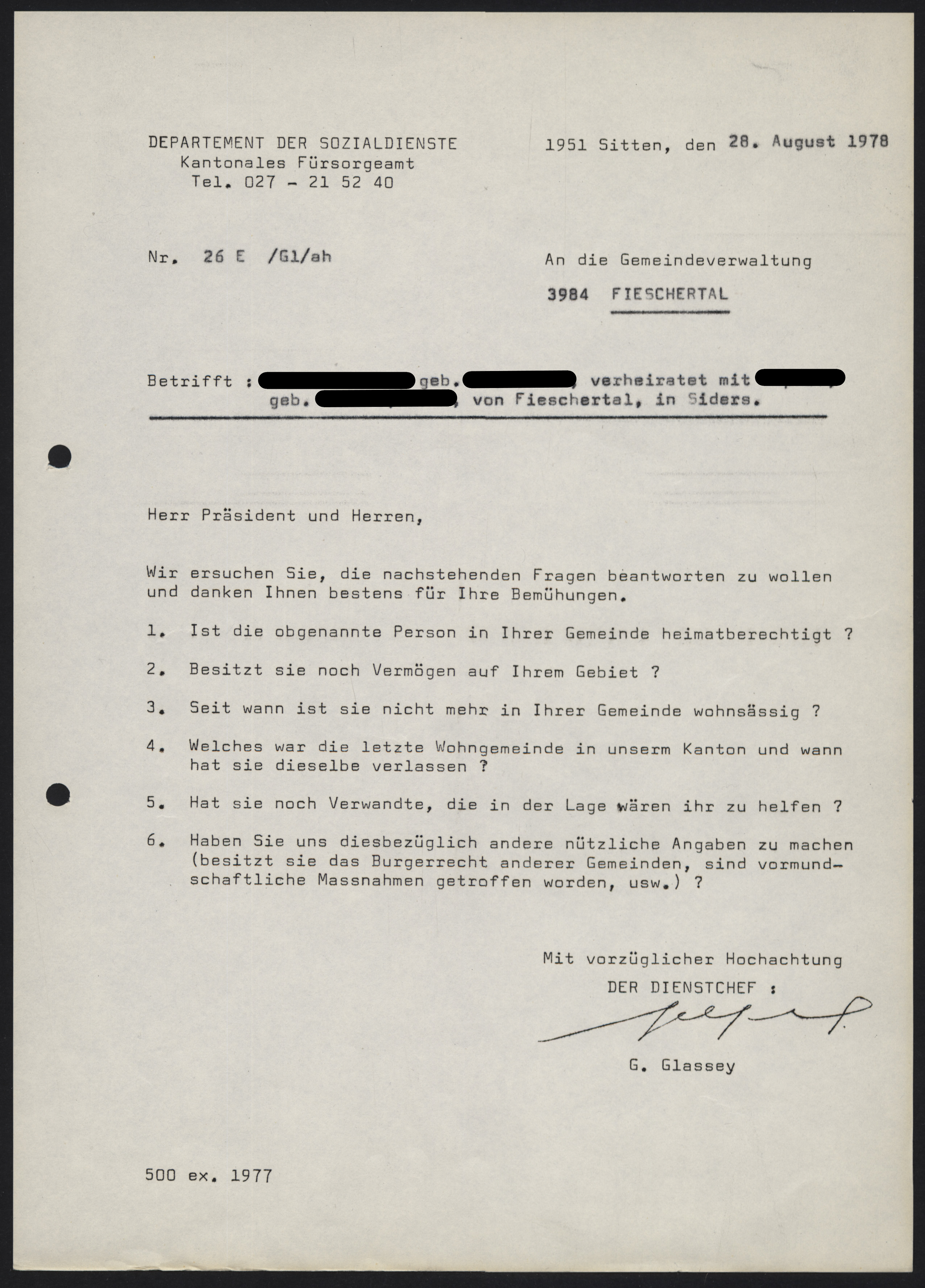 Pour cela, les collaborateurs des Archives de l'Etat du Valais ont exploré différents fonds, dont le fonds de l'actuel Service juridique de la sécurité et de la justice (SJSJ), qui contient des dossiers de mesures de coercition à des fins d'assistance et de placements extrafamiliaux (AEV, fonds 5060-4 et 5060-5), le fonds de l'actuel Service de l'action sociale (SAS), qui contient des dossiers de bénéficiaires de prestations sociales (AEV, 4620-5), et le fonds de l'actuel Office pour la protection de l'enfant (OPE), qui contient des dossiers de personnes prises en charge (AEV, 4640-1993/65). La recherche de dossiers est complétée par la recherche dans les archives communales de documents relatifs à l'office des orphelins et à l'assistance publique et, si nécessaire, étendue aux archives des autorités de protection de l'enfant et de l'adulte. Même si, dans de nombreux cas, de telles recherches de dossiers ne donnent qu'une image incomplète, elles permettent de retracer les biographies des personnes concernées et d’apporter des réponses à des questions existentielles.