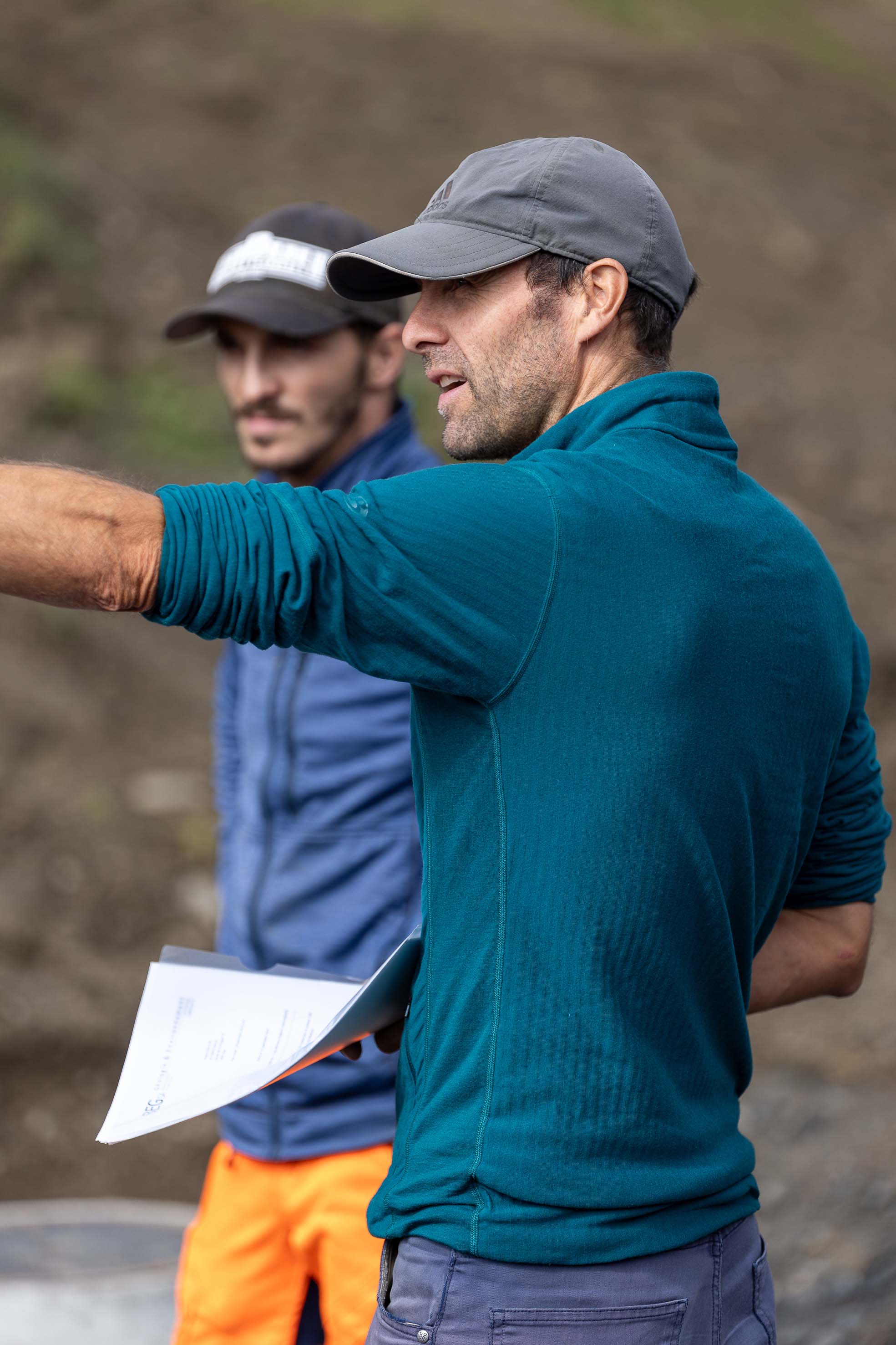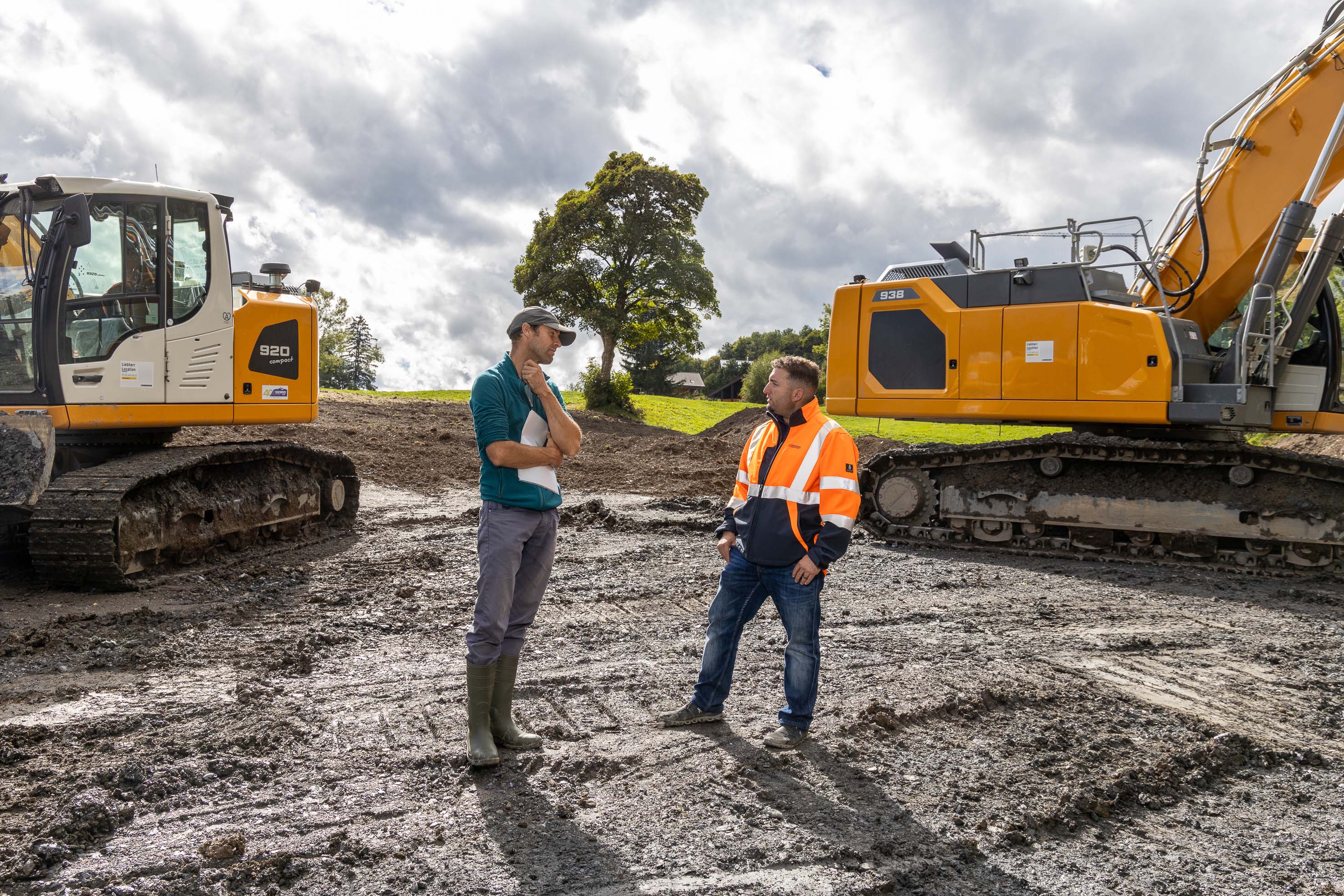 Randogne : nous sommes à destination. Du coffre de son véhicule, Frédéric Schlatter sort une paire de bottes qu’il enfile à la place de ses chaussures de ville. En contrebas de la route, dans un décor de carte postale, deux imposantes pelleteuses grattent le sol au milieu des prés. Le pédologue cantonal a fait le déplacement depuis Sion pour suivre de près ce chantier de remodelage et de réhabilitation de sol. « Les sols étaient ici partiellement dégradés par l’exploitation et le relief des champs très bosselé, ce qui péjorait l’exploitation agricole. Une fois les sols réhabilités et la surface remodelée, elle sera bien plus facile à mécaniser », explique-t-il.