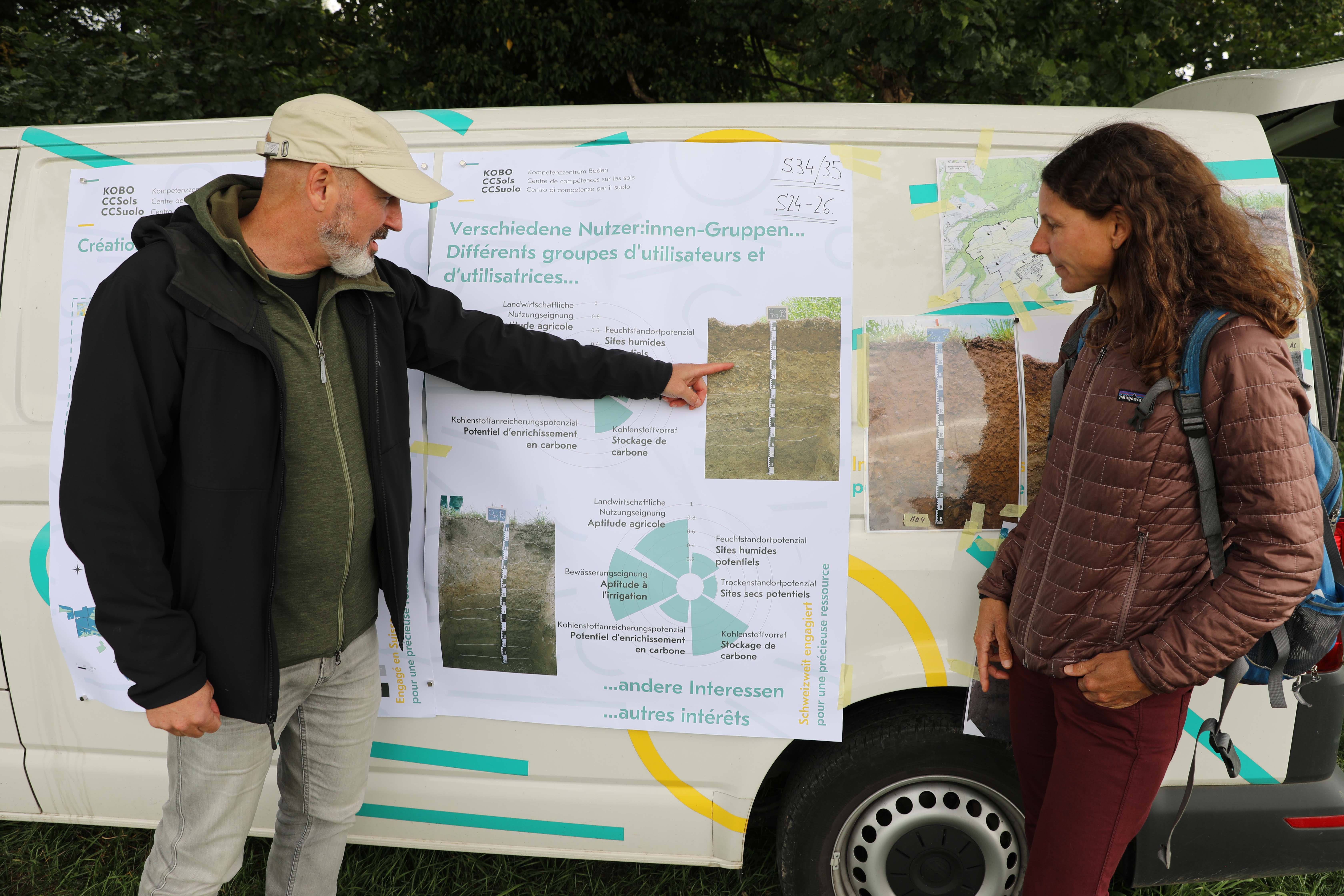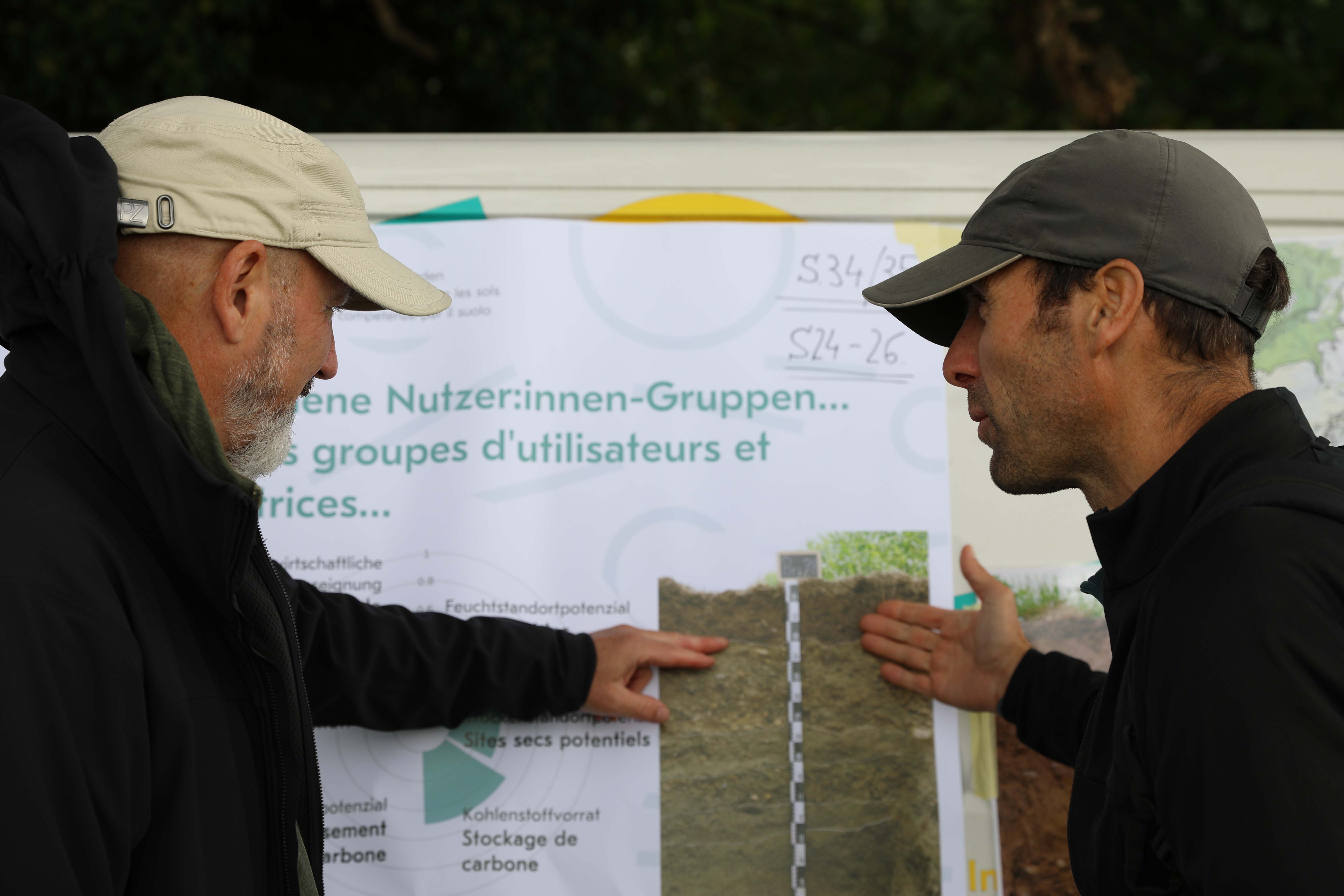 Récemment, le duo a participé à Fribourg à des ateliers sur la cartographie des sols, dans le cadre d’une journée organisée par le Centre de compétences sur les sols (CCSols), la référence suisse dans ce domaine. « Cartographier les sols, c’est en fait inventorier leur qualité et leur profondeur », explique Armin Keller, directeur du Centre. « Nous développons de nouvelles approches pour rendre cette pratique plus rapide et moins coûteuse. Un autre défi est d’uniformiser les méthodes à l’échelle nationale. »