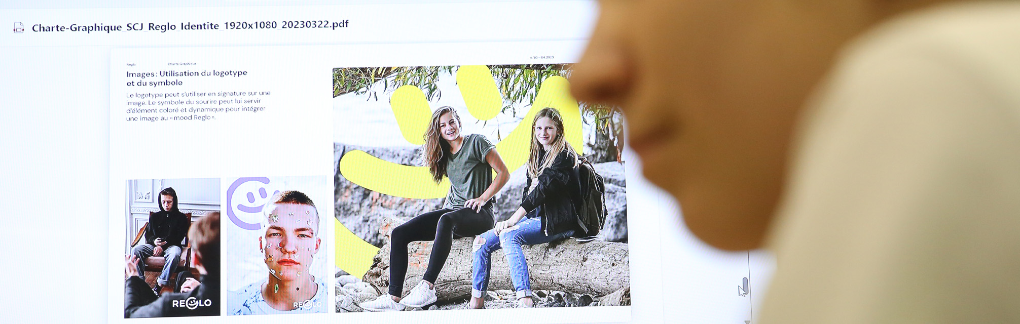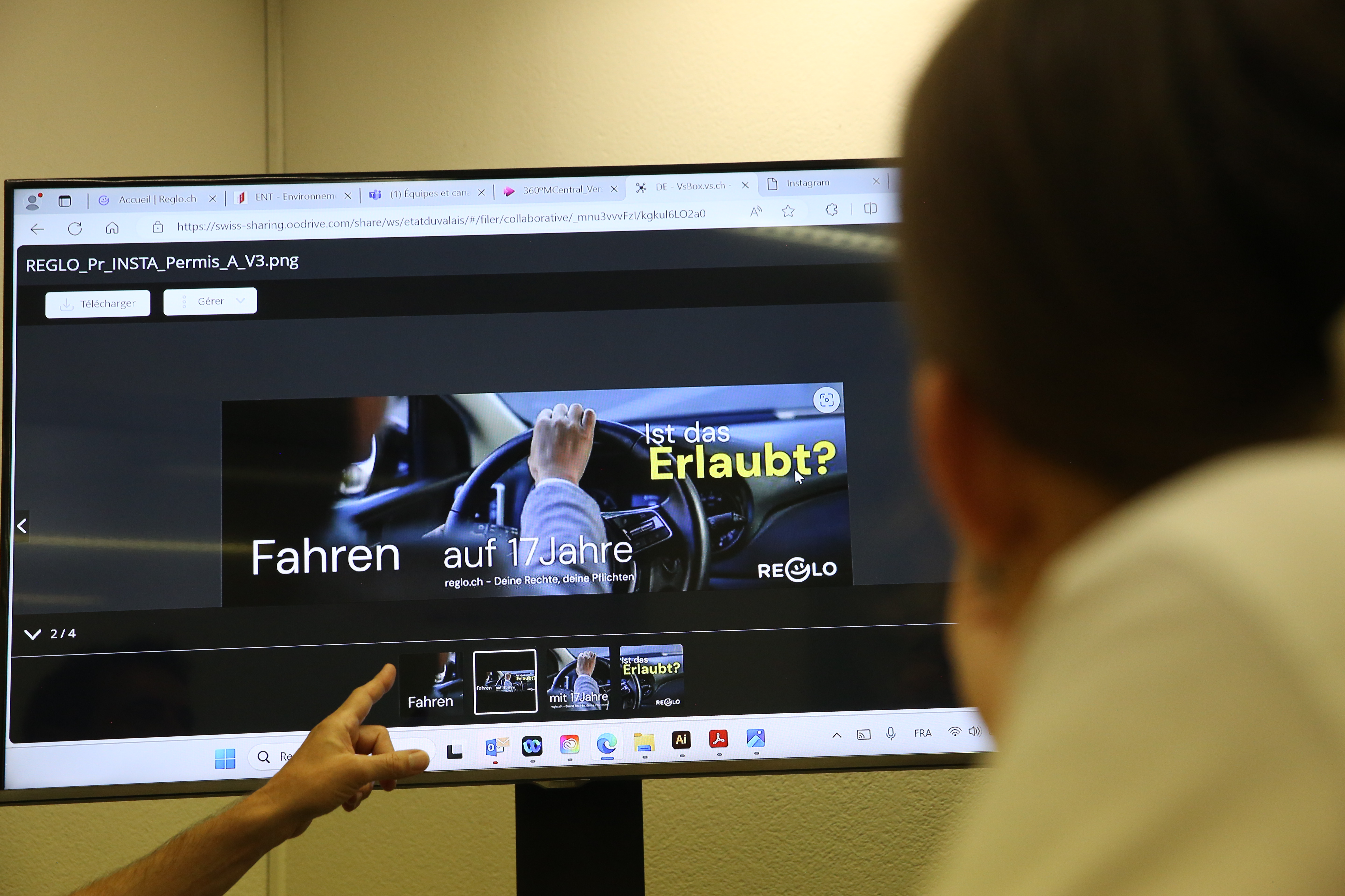 « Est-ce que tu as apporté les modifications dans la version allemande ? » demande Cédric Bonnébault. Aurélien affiche les visuels à l’écran pour que le délégué à la jeunesse puisse valider les dernières versions des futures publications du compte Instagram de Reglo.ch. Une fois le feu vert reçu, l'équipe choisit l'ordre de publication des trois visuels prêts. C'est la thématique du désendettement qui sera mise en ligne en premier, suivie par des posts sur la formation, le travail et le permis de conduire. Les rôles s'inversent alors : le délégué à la jeunesse, chargé de la publication, reçoit les instructions des membres du groupe pour mener à bien sa tâche.
