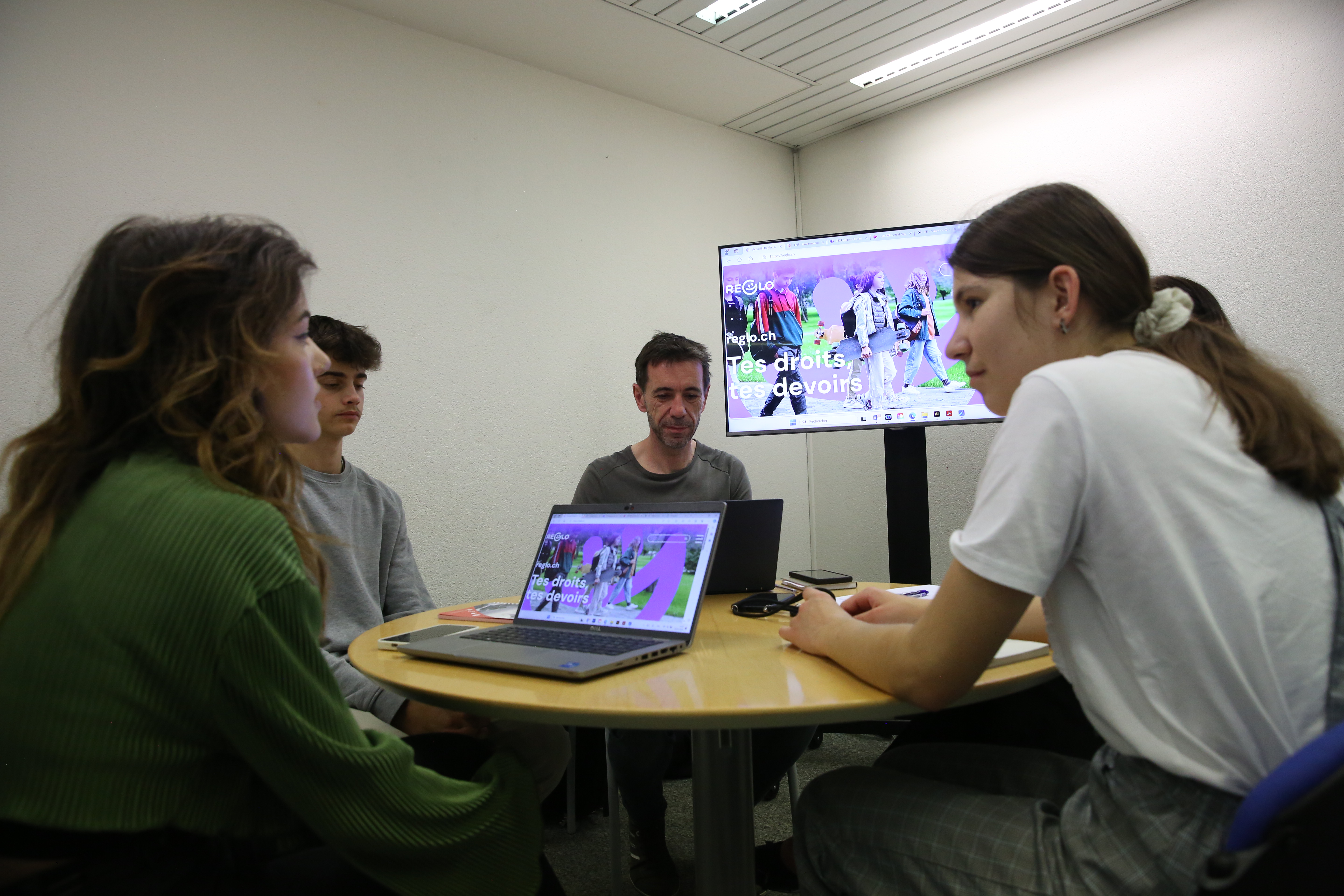 C'est dans les locaux du Service de la formation professionnelle (SFOP) que le groupe de communication de Reglo.ch se réunit pour sa séance de travail hebdomadaire. Autour de la table, Núria Simões, apprentie médiamaticienne en 4ème année, Maya Pitteloud, apprentie de 1ère année, Aurélien Héritier, également en 1ère année mais auprès de la Police cantonale, et Cédric Bonnébault, délégué à la jeunesse et coordinateur du projet.