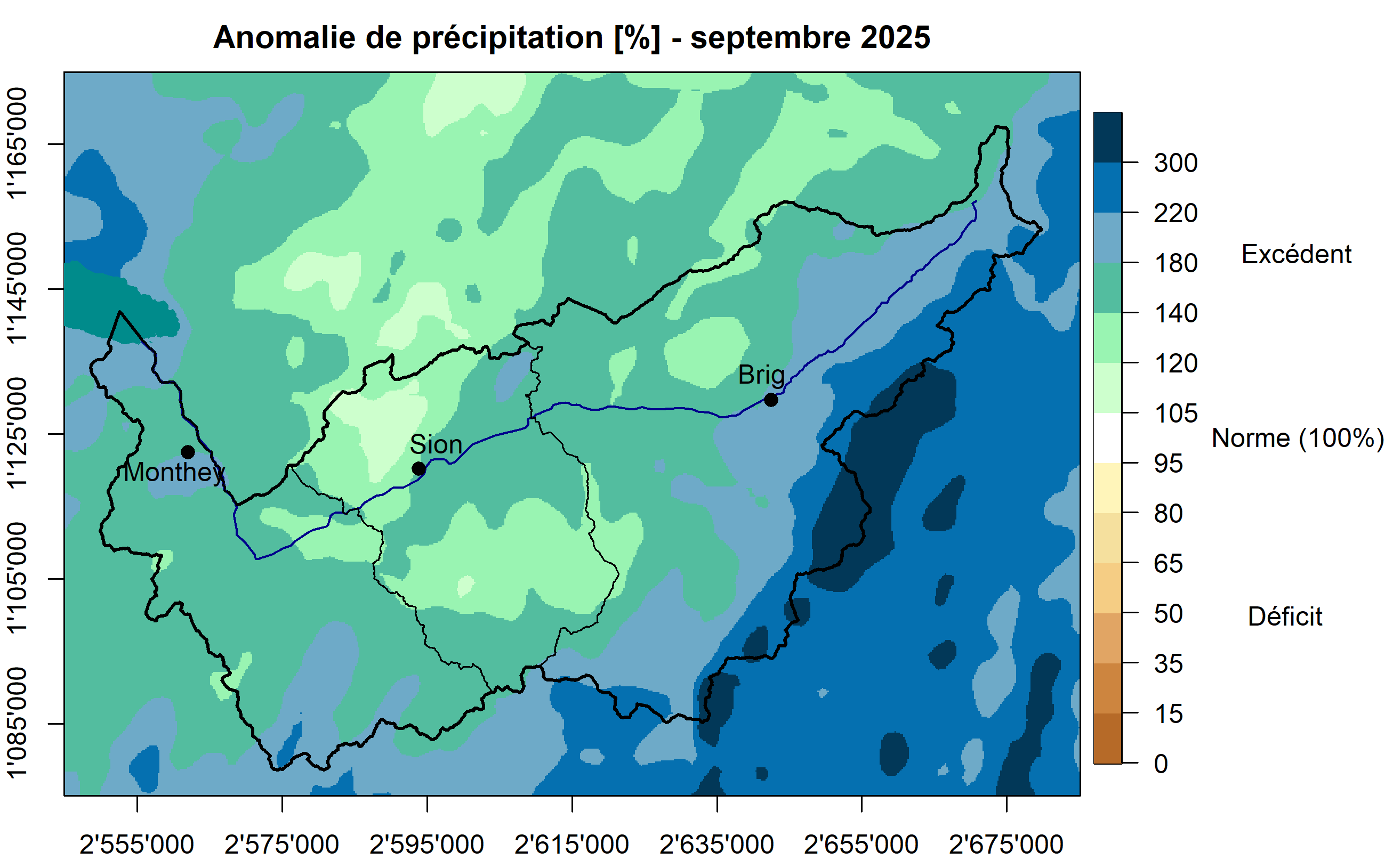 Figure 2: Anomalie mensuelle de précipitations pour septembre 2025 exprimée en % par rapport à la période de référence 2010-2024. Source : MétéoSuisse/CREALP.