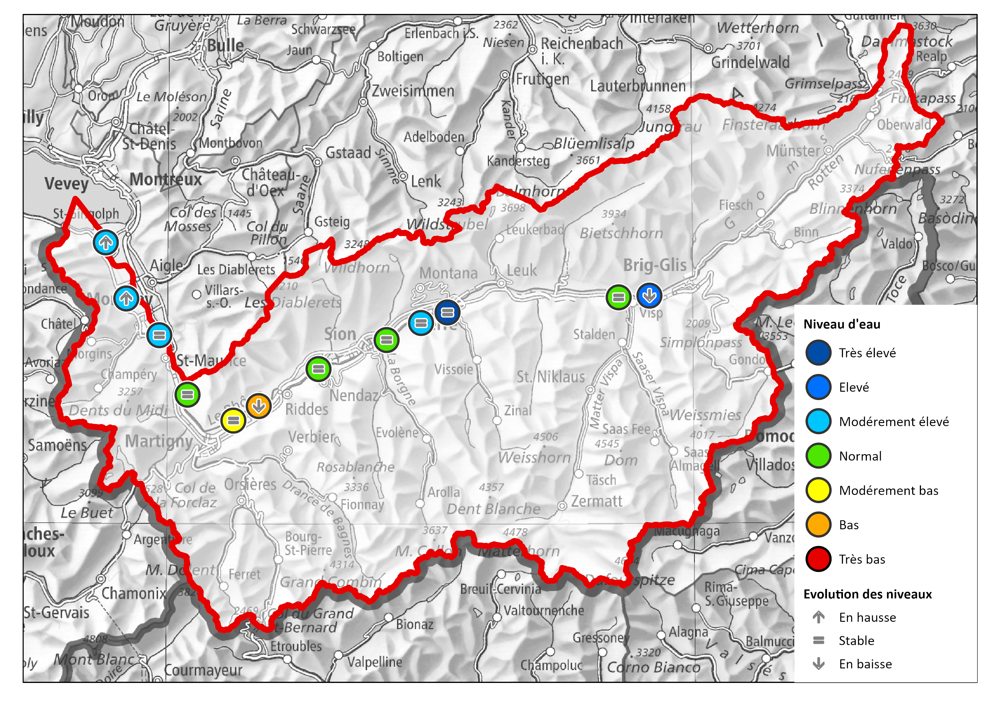 • Région Haut-Valais : Niveaux de nappe supérieurs ou égaux à la normale et tendance s’orientant à la baisse.
