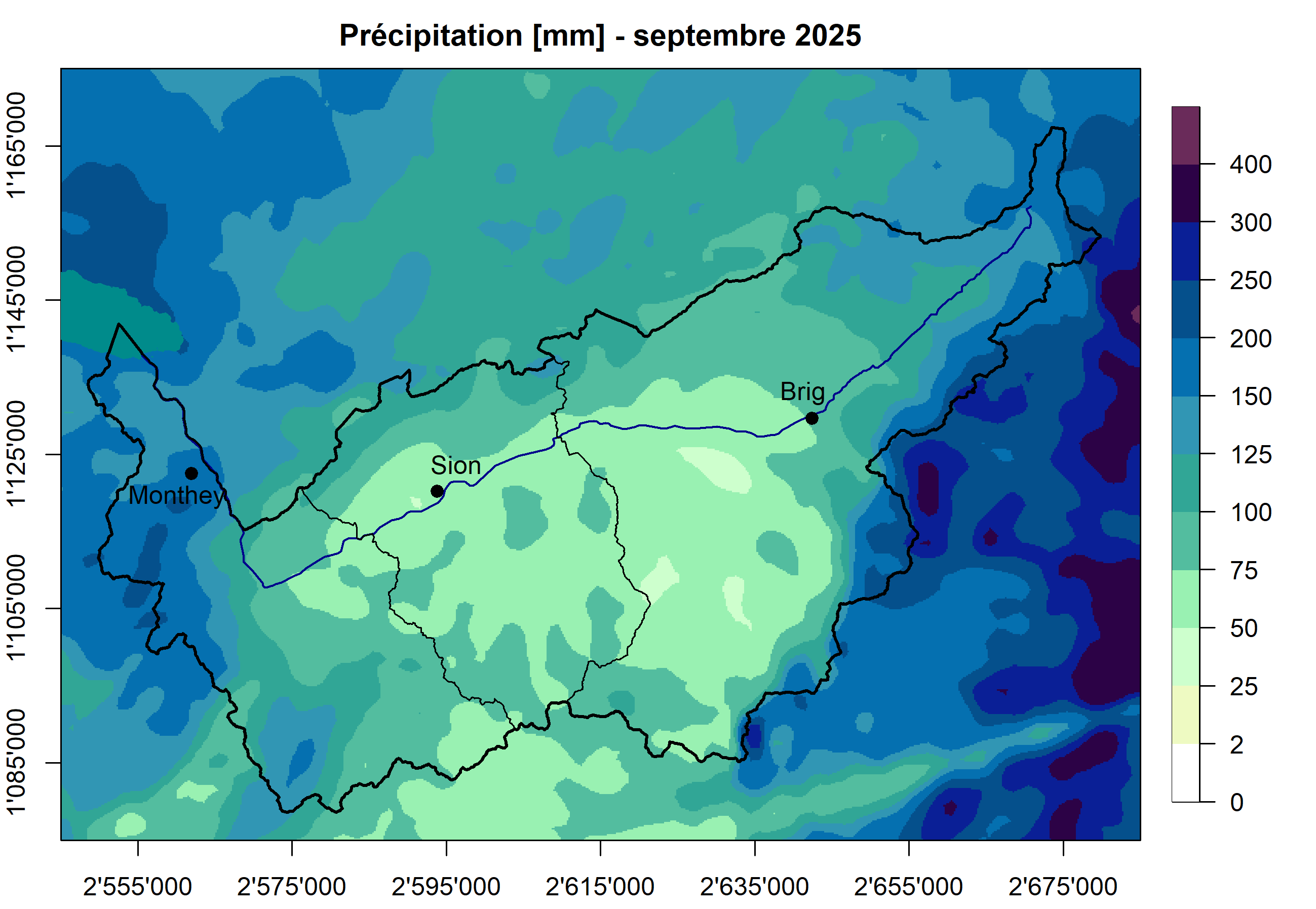 Figure 1: Cumul de précipitations en millimètres pour septembre 2025. Source : MétéoSuisse/CREALP.